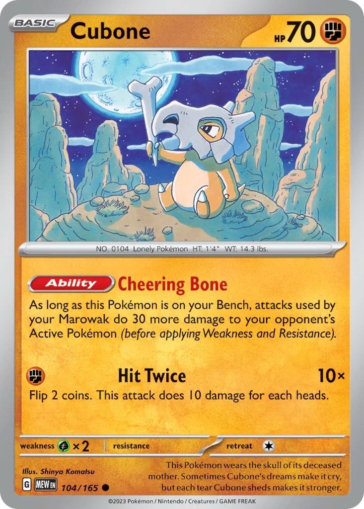 This Pokémon wears the skull of its deceased mother. Sometimes Cubone's dreams make it cry, but each tear Cubone sheds makes it stronger.